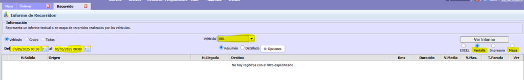 - Indica el vehículo, la fecha y hora de inicio y fin del recorrido.